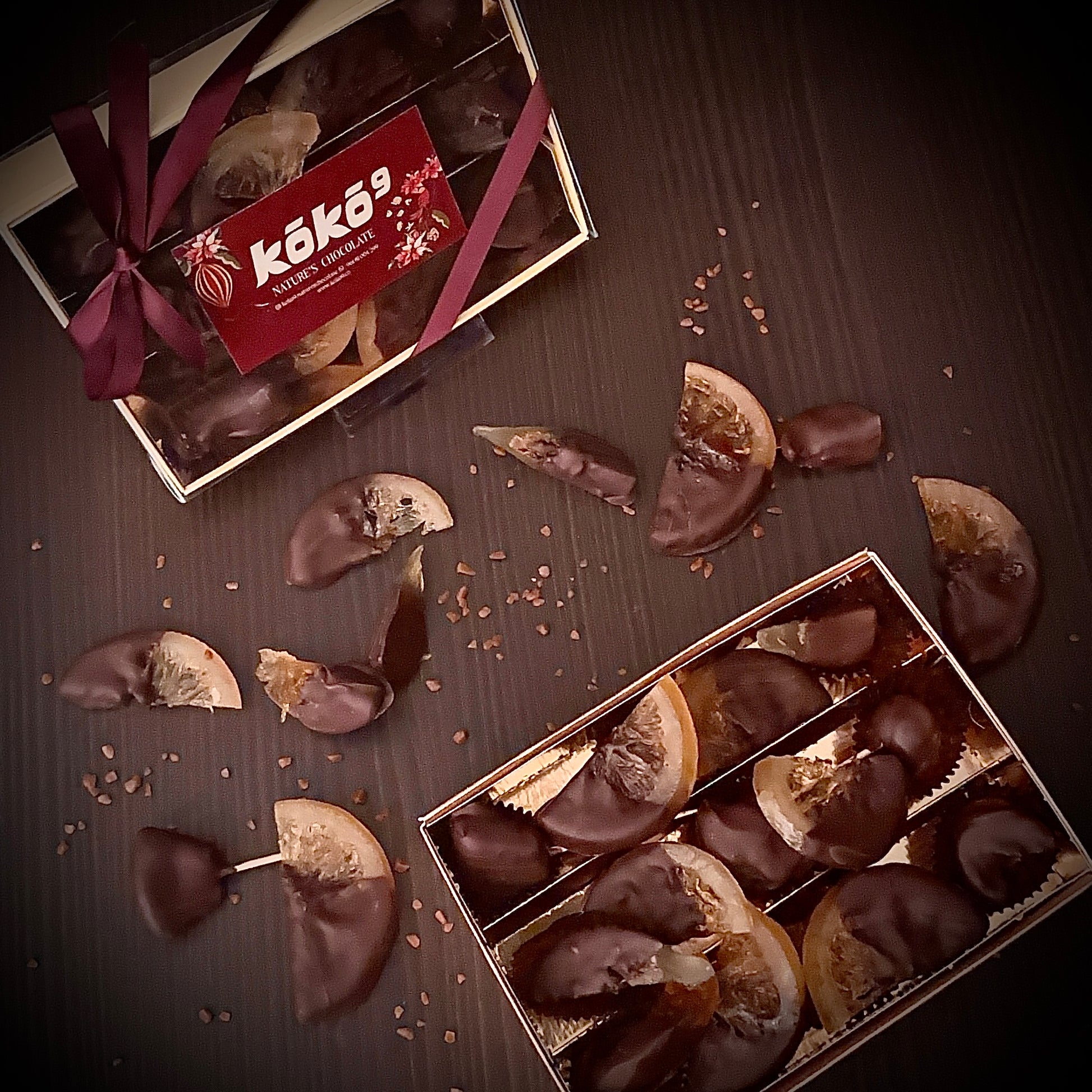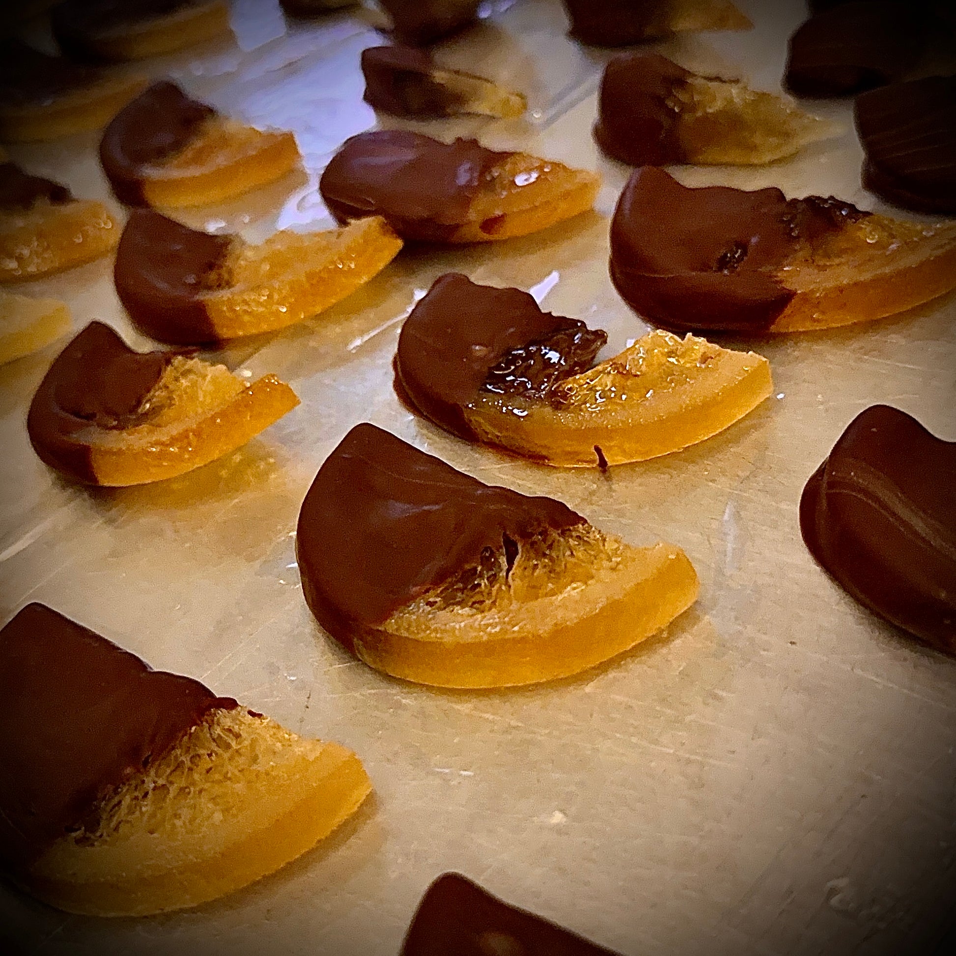 A luxurious selection of candied fruits – orange, lemon, fig, marron glacé, pineapple, pear, and apricot – dipped in rich dark chocolate. Perfect for gifting or a decadent treat.