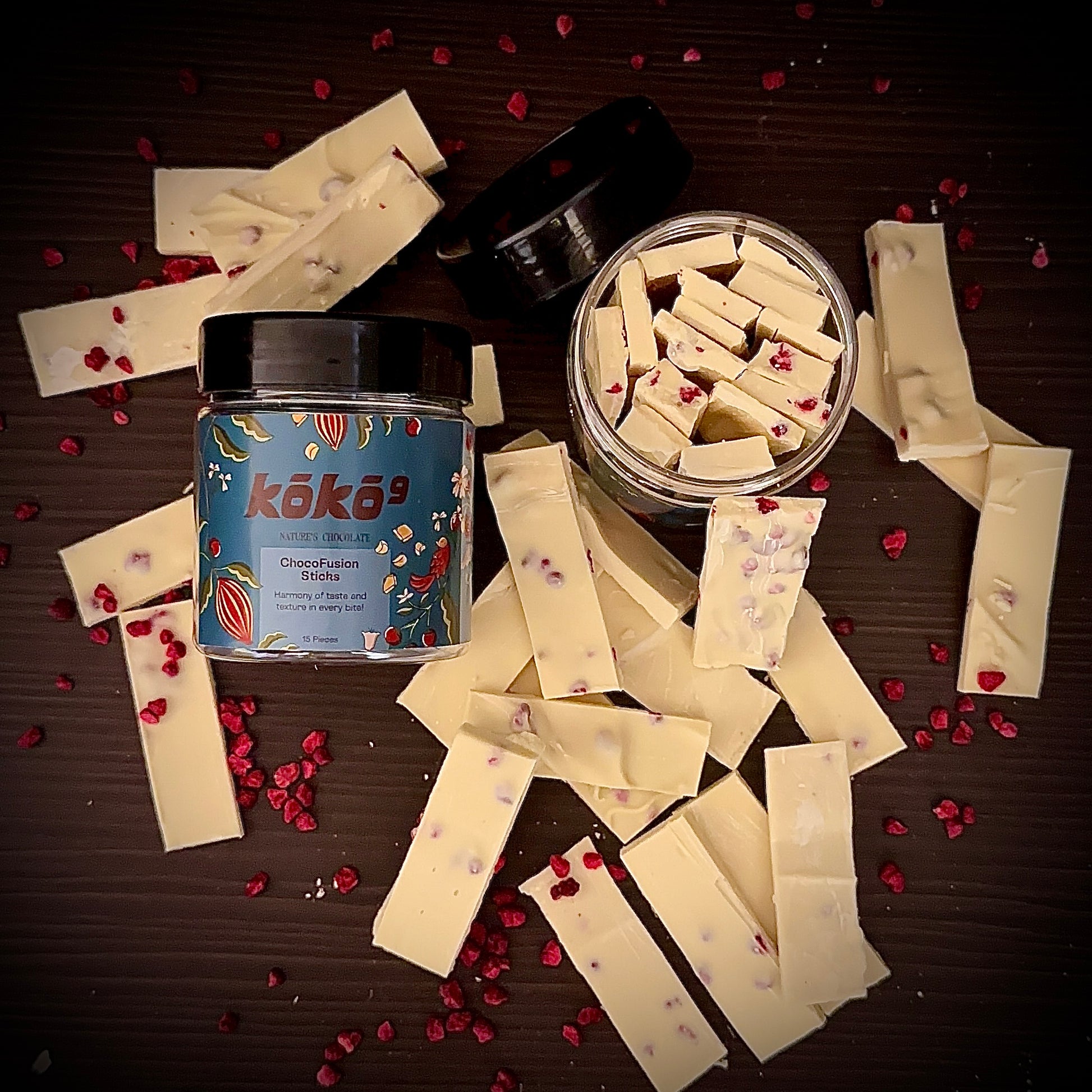 Chocofussion Sticks: A delightful collection of Dark, Milk, and White Chocolate Infused with a variety of flavors, offering a harmonious blend of taste in every bite. Each flavor is sold separately in elegant jars.